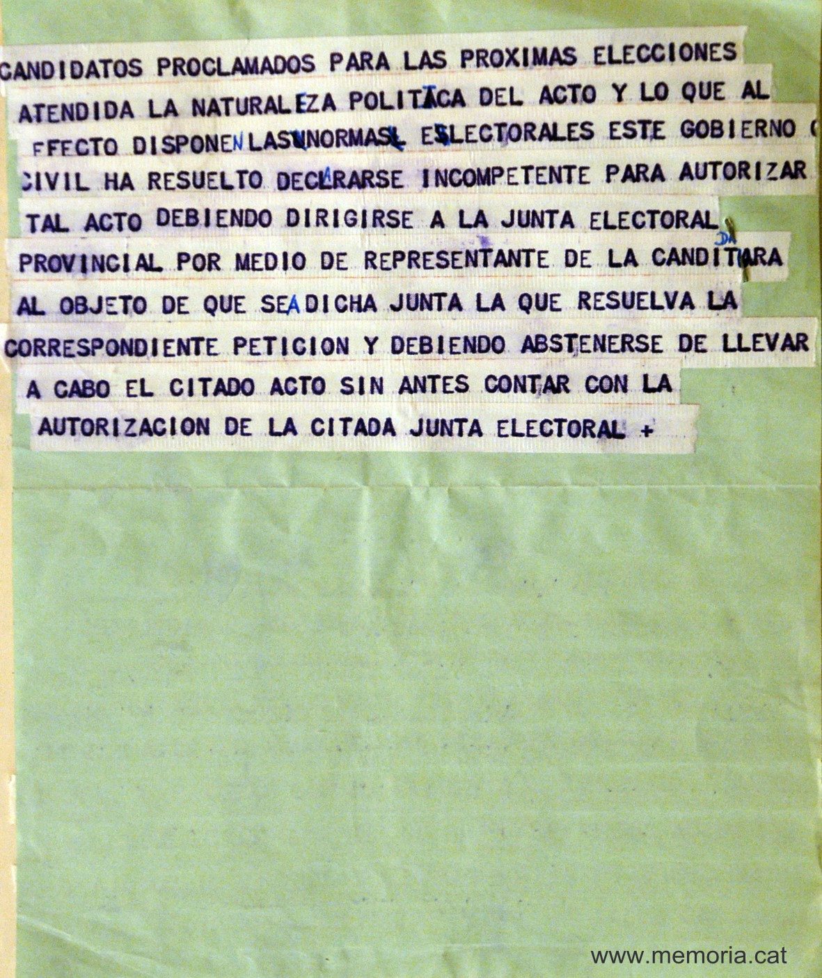 El Govern Civil va autoritzar tots els actes excepte els parlaments perquè “atendida la naturaleza política del acto y lo que al efecto disponen las normes electorales este gobierno civil ha resuelto declararse incompetente para autoritzar tal acto, debiendo dirigirse a la junta electoral provincial”.