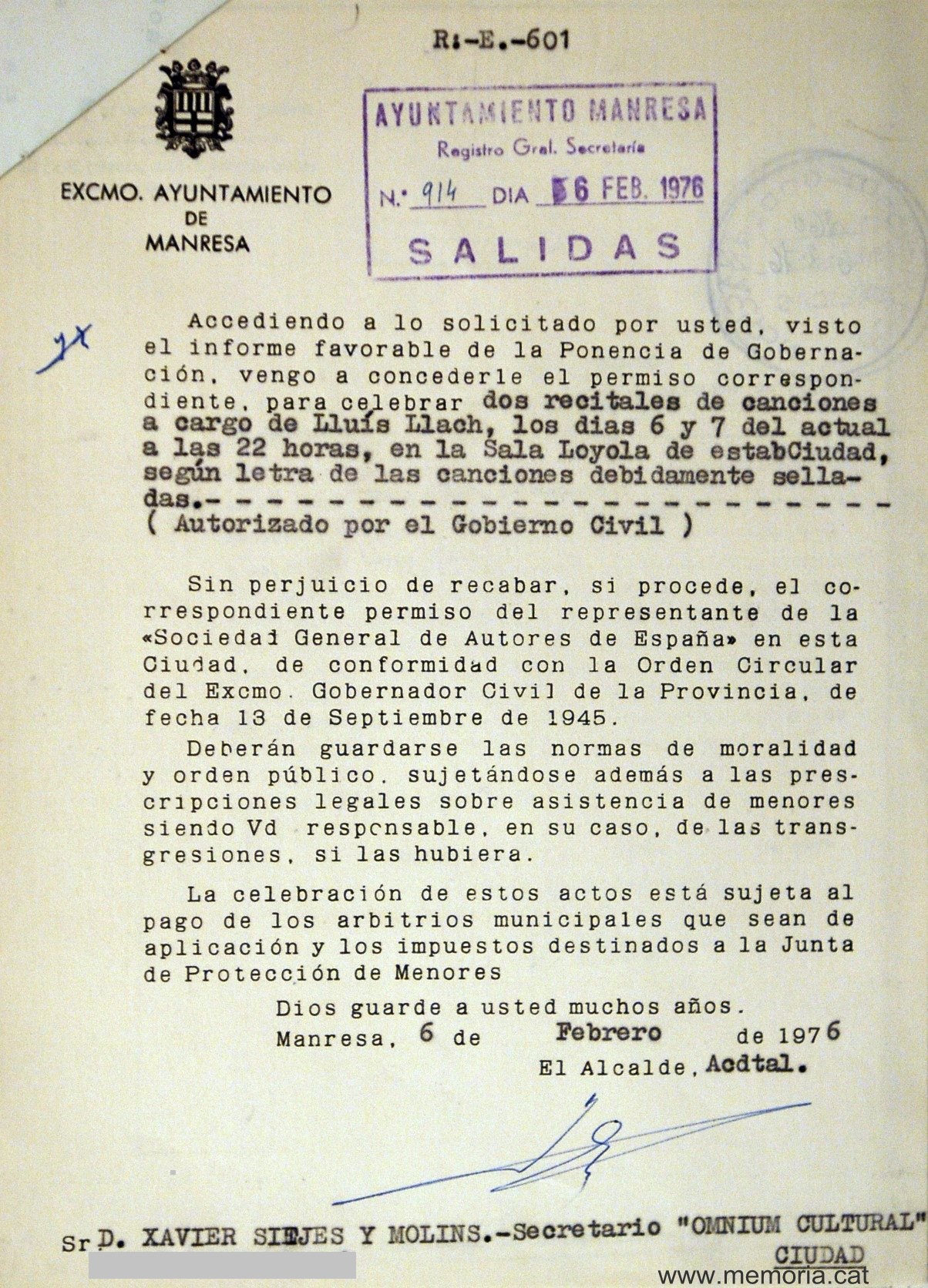 - Recitals de Lluís Llach a la Sala Loyola el 6 i 7 de febrer de 1976, organitzats per Òmnium Cultural. Hi va haver una gran afluència de públic i la primera fila estava ocupada per representants del Secretariat d’Entitats de Manresa.El diari Manresa de 7 de febrer de 1976 titulava: “Un millar de personas escucharon anoche a Lluís Llach”. L’ article explicava que “se caracterizó por un casi irrefrenable entusiasmo del público que coreó todas las piezas y mantuvo las clásicas cerillas encendidas […] destacando los títulos ‘L’estaca’ […] un público enfervorizado que principalmente en la primera parte prorrumpió en muchos gritos de ‘Viva la República’, ‘Visca Catalunya’, ‘Estatut’. A la salida, la fuerza pública invitaba a circular cosa que, junto con la llovizna que caia, hizo que se cumpliera la consigna, con la excepción de un grupo bastante numeroso subiendo por la calle Derechos y Francisco Morell que repetían los gritos pronunciados en el interior de la sala. Ya en la plaza Infantes se disolvieron.”La notícia del recital del dia 7 es titulava: “Llach ratificó su éxito”. Comparant-ho amb l’anterior recital, l’article explicava: “Iguales banderas, pancartas y vítores, pero el ambiente quizás menos tenso. En la calle, frente a la sala, las personas que no habían podido entrar eran invitadas a circular por la fuerza pública para evitar aglomeraciones. Terminado el recital, al filo de la medianoche, hacia Bajada Derechos y Francisco Morell se formó una manifestación con cerca de un centenar de personas que fueron disueltas por la Policía Armada”.