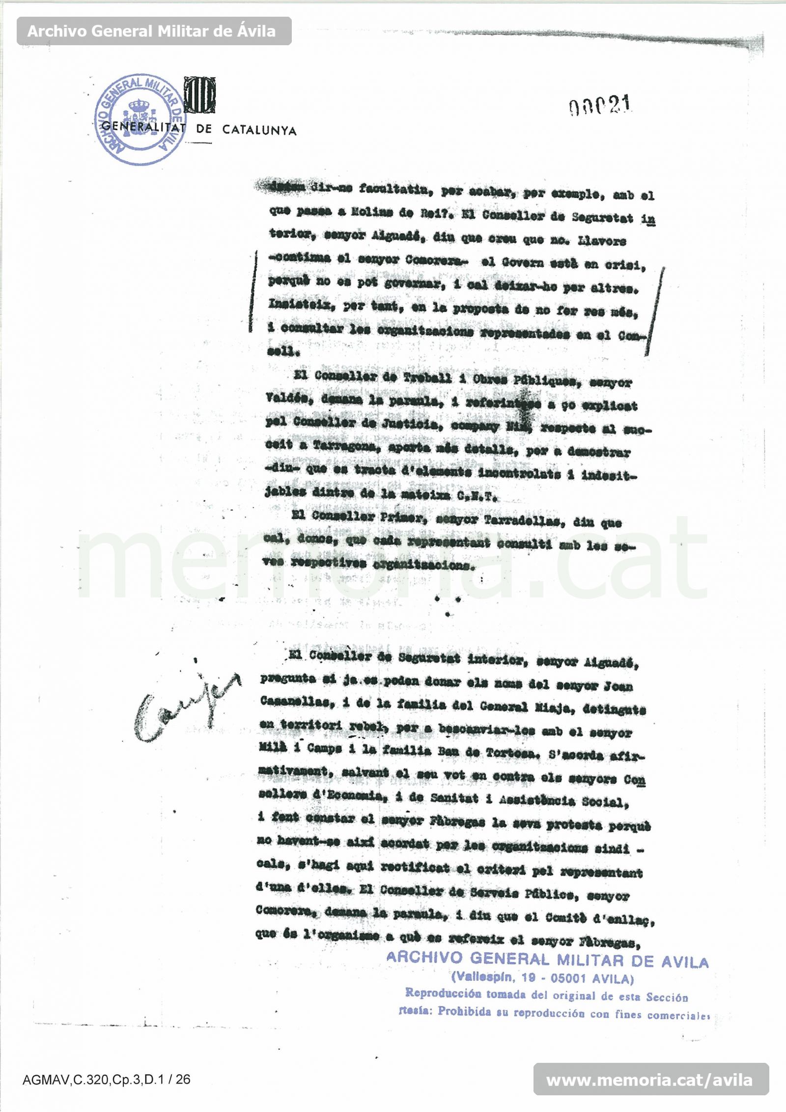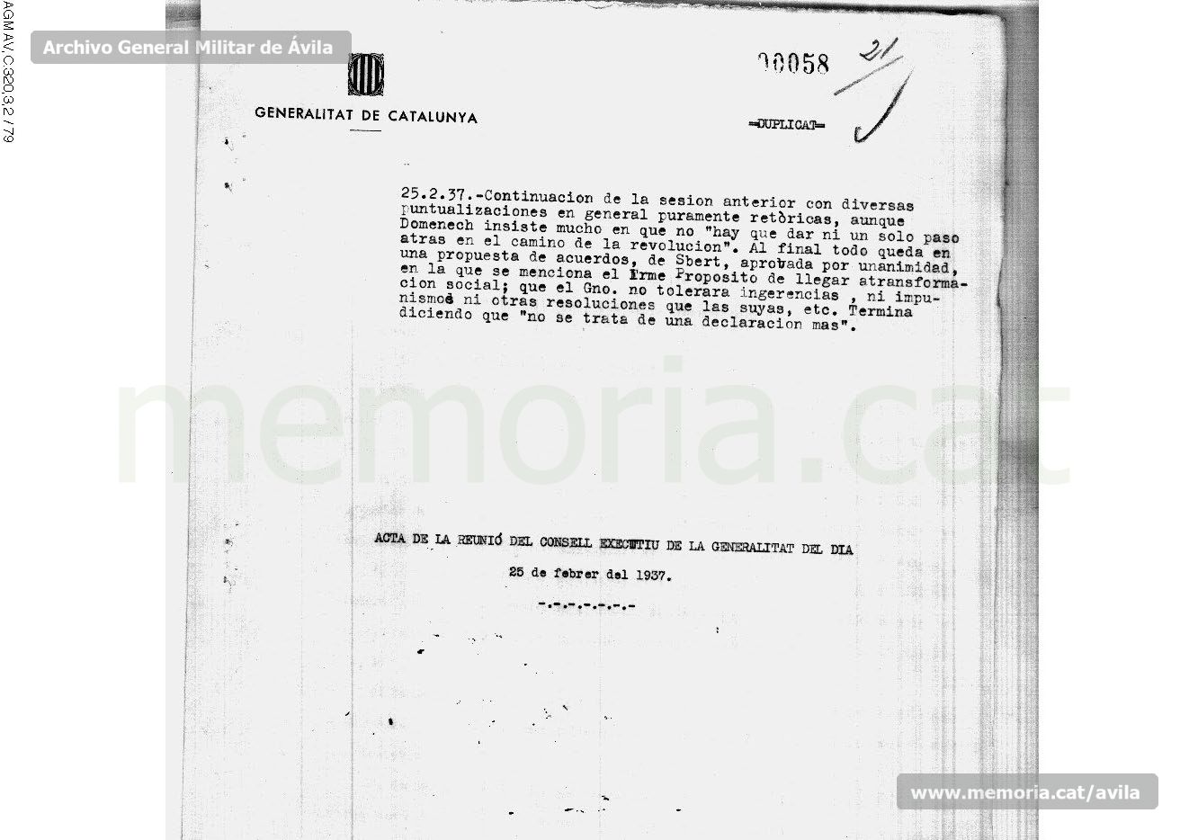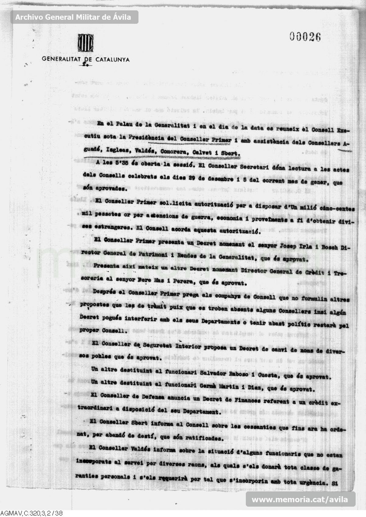 Actes de les sessions del Consell Executiu de la Generalitat de Catalunya , presidides per Lluís Companys (novembre 1936-febrer 1937). (A cada acta hi precedeix un comentari-resum redactat pels franquistes)