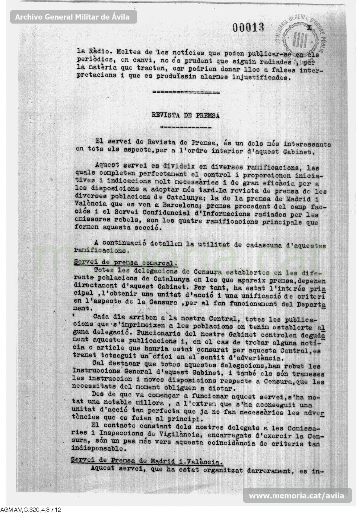 «Memòria del Gabinet de Censura». (Generalitat de Catalunya. Comissaria General d’Ordre Públic de Catalunya. Gabinet de Censura). (Barcelona, 1/11/1937)