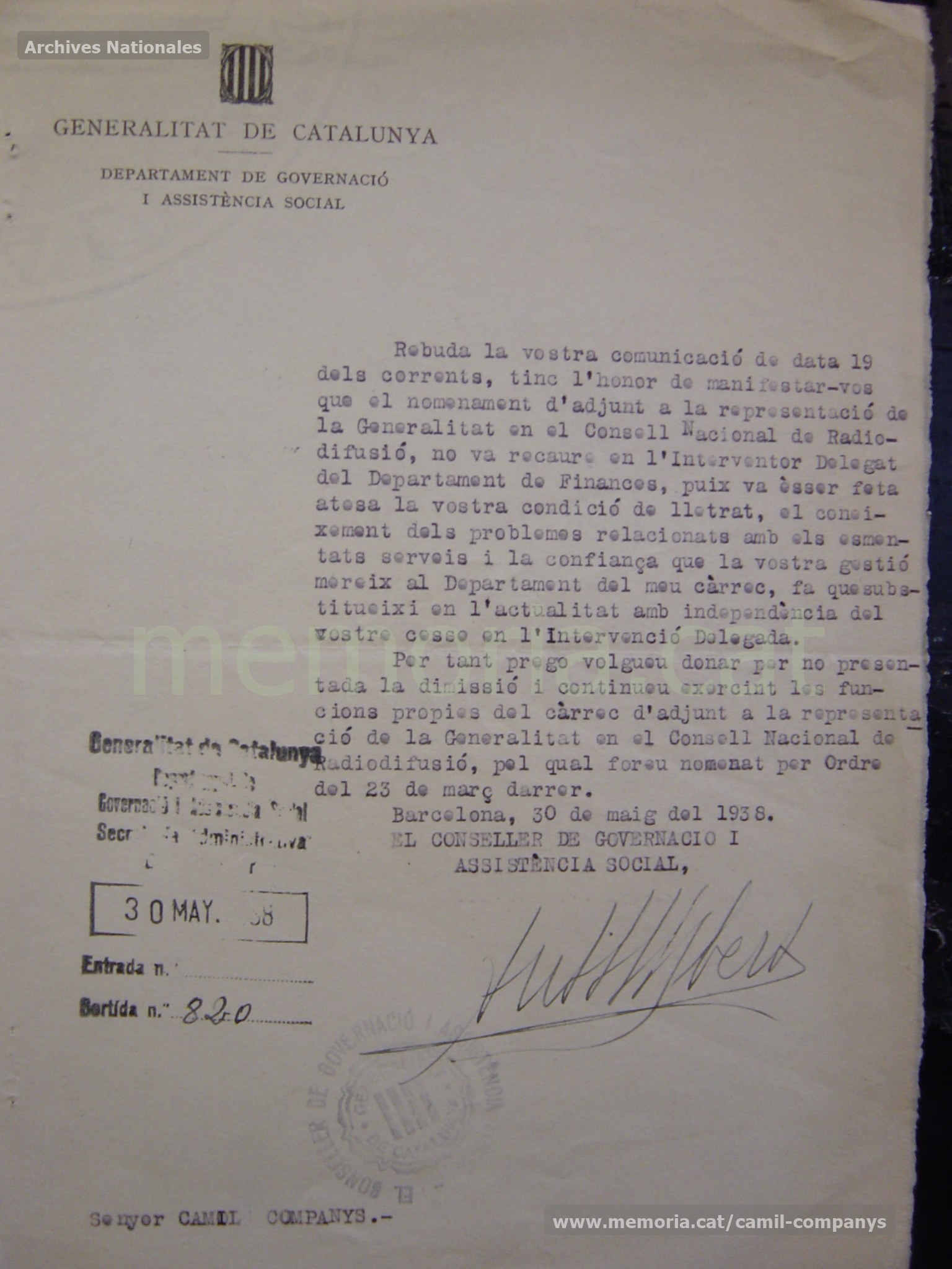 Dos documents més que Camil Companys conservava a l’exili: una carta del maig del 1938 del Conseller de Governació Antoni Maria Sbert pel qual li prega de reconsiderar la seva dimissió del càrrec de representant de la Generalitat al Consell Nacional de Radiodifusió, i un llistat de decrets i ordres de la Generalitat sobre la Radiodifusió a Catalunya.