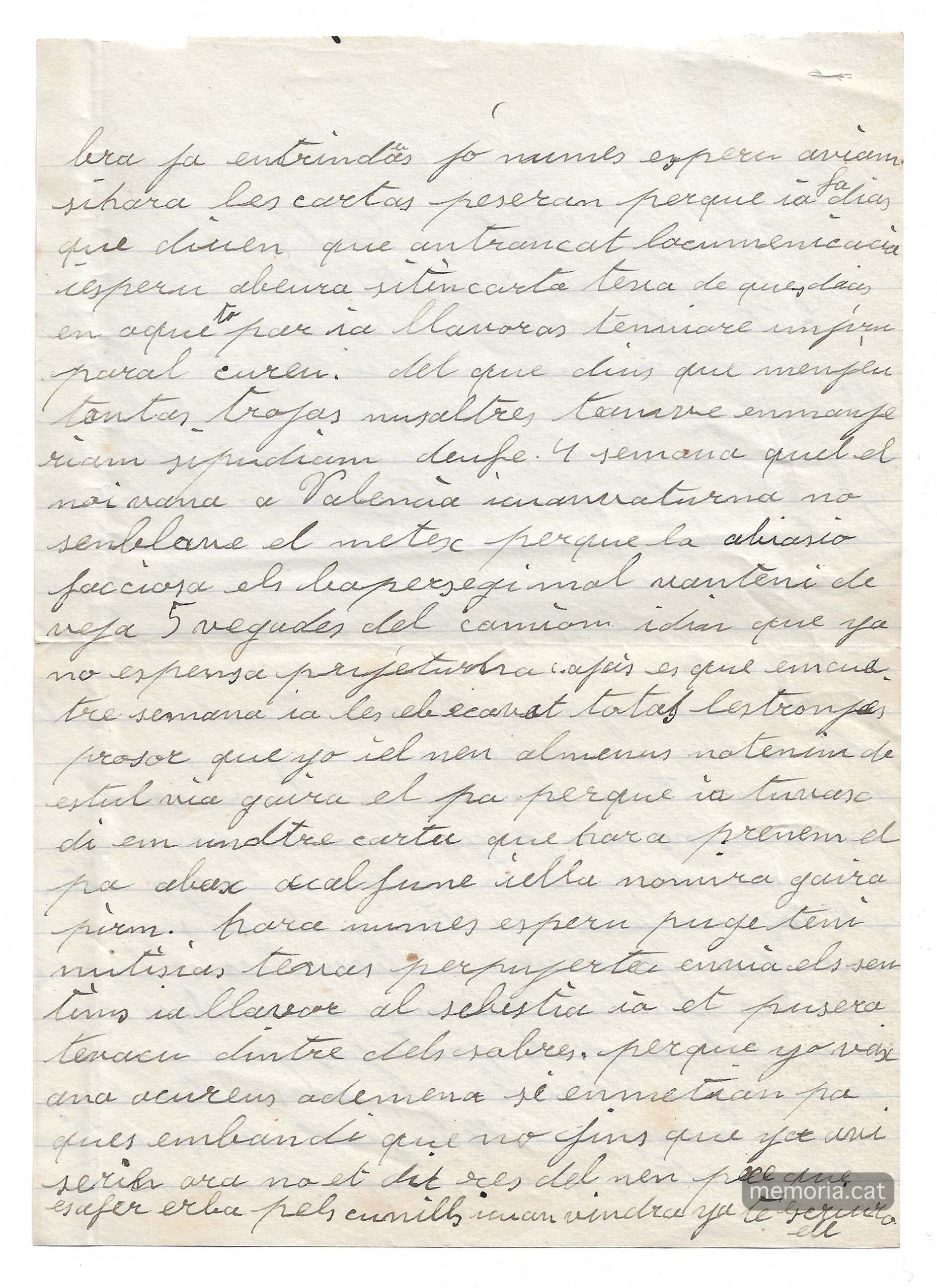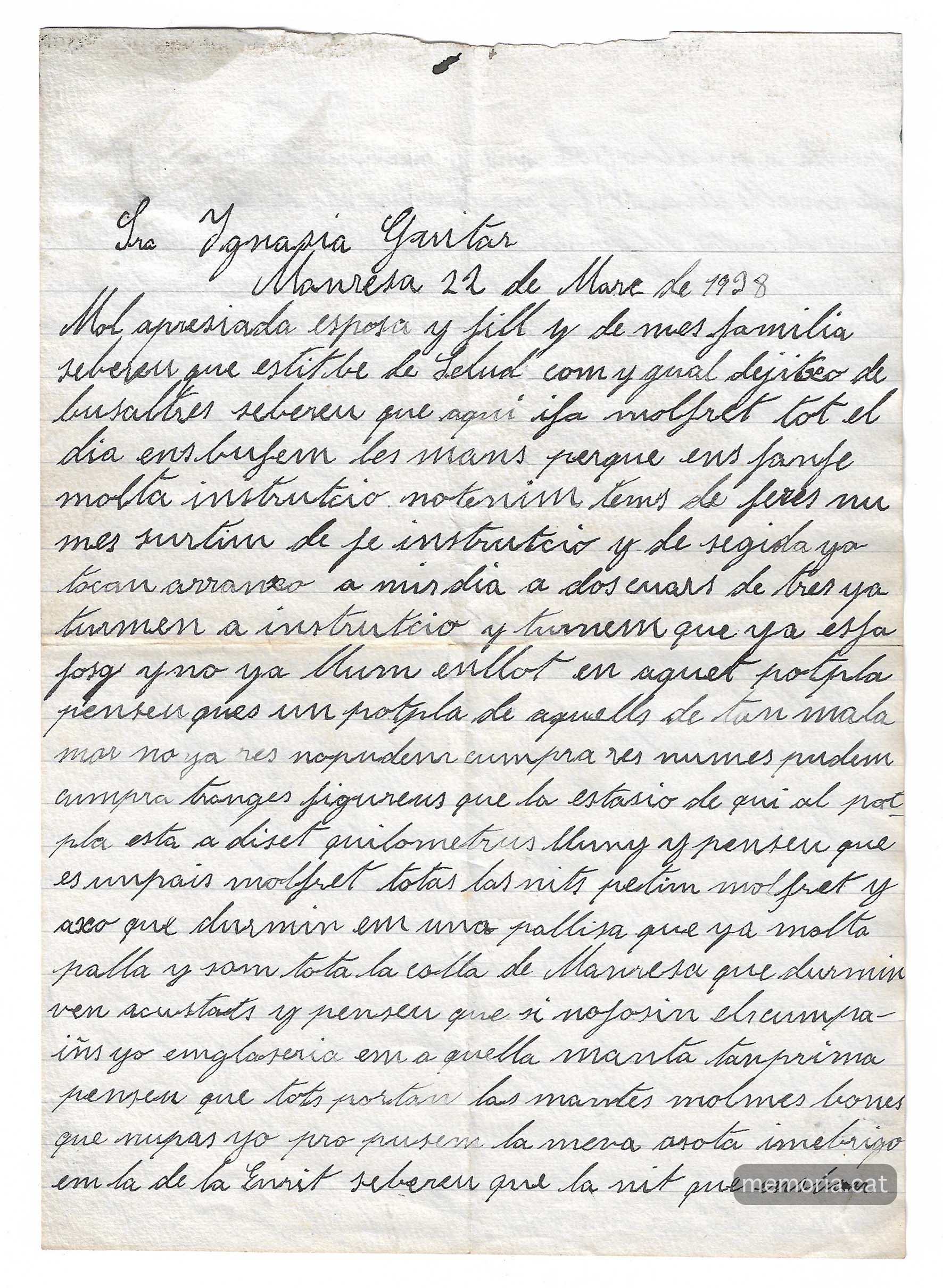 “Manel ja pots pensar en l’angoixa que estic, cada dia espero el carter pensant: avui sí que tindràs carta però cada dia tinc un desengany més. N’hi ha que diuen que és que les cartes no passen, però ahir va venir el Joanet de la Francisqueta i li vaig preguntar a veure on era el Nestu i em va dir que era a València i que cada setmana tenien carta. Sembla estrany que tu amb tota la colla que escrius ni els uns ni els altres sapiguem res de tu perquè el Josep Maria diu que tampoc sap res. No és perquè em pensi que tu has deixat de pensar en nosaltres però no sé si és que t’ha passat alguna cosa o si estàs malalt i ets lluny dels teus companys i no pots fer escriure per ningú. Pensa que la mare també està molt neguitosa al veure que fa tants dies que no sap res”.
