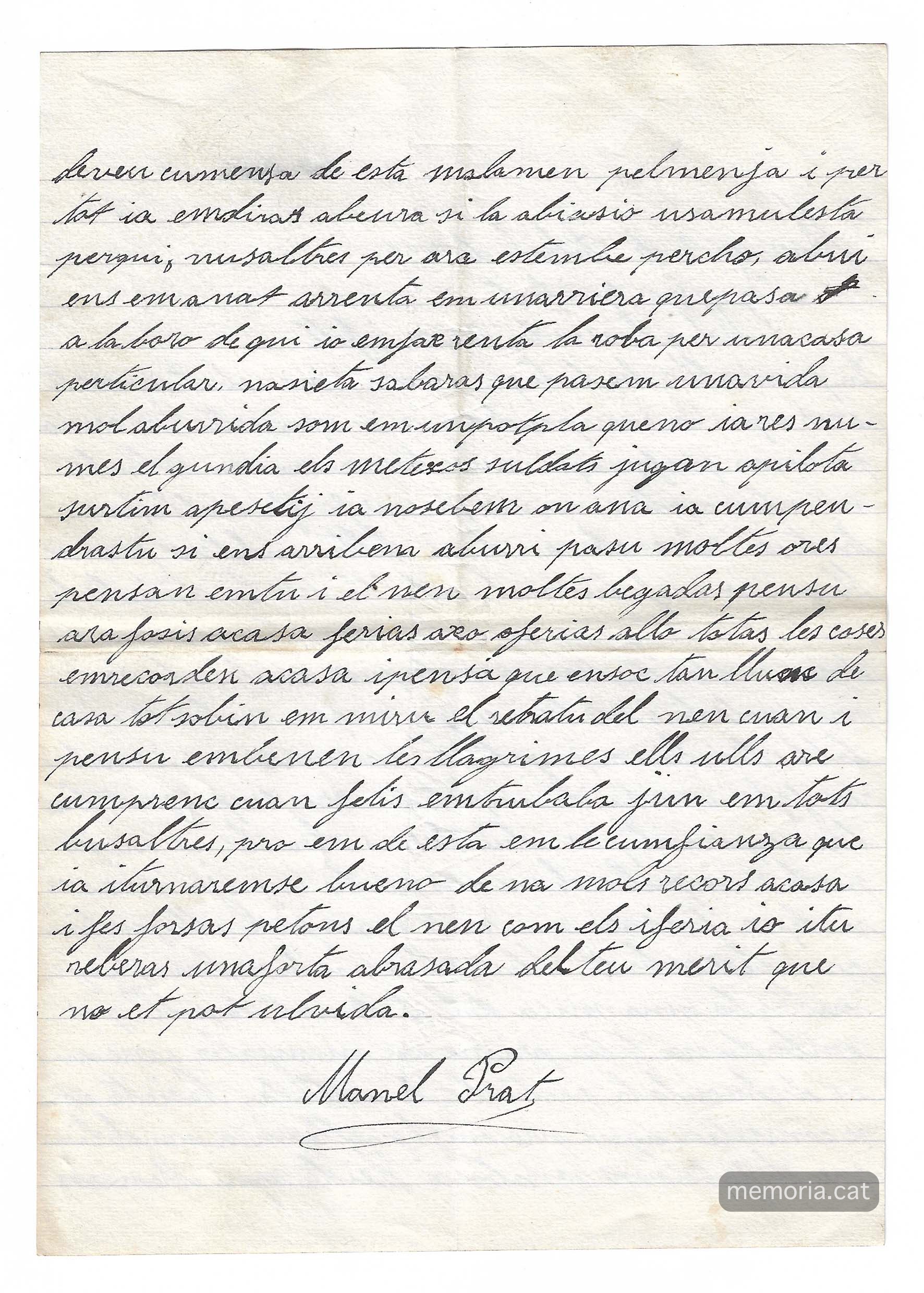“…mi marido Manuel Prat era muy amigo de Vd. Pues como sus padres han recibido noticias de Vd. me he creído que Vd. podría darme alguna noticia de él que no sé qué es lo que ha ocurrido. Esperándome me contestará tan pronto como estas noticias lleguen a su poder y espero querrá decirme la verdad. Esperando ser correspondida le doy las gracias por las molestias que le causo”.