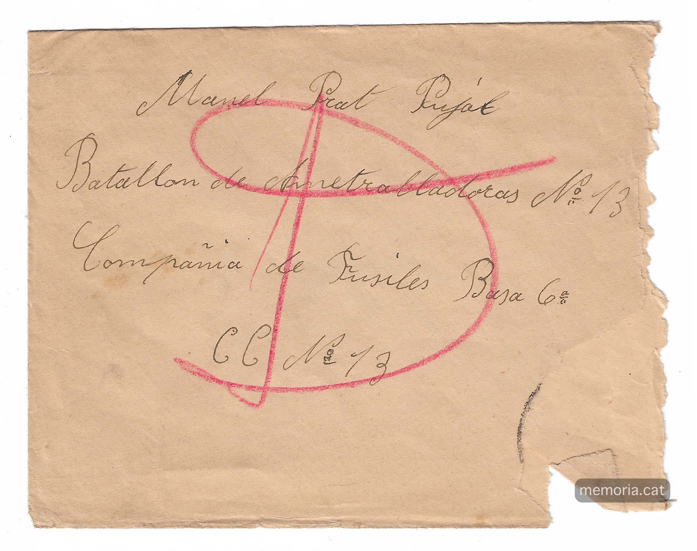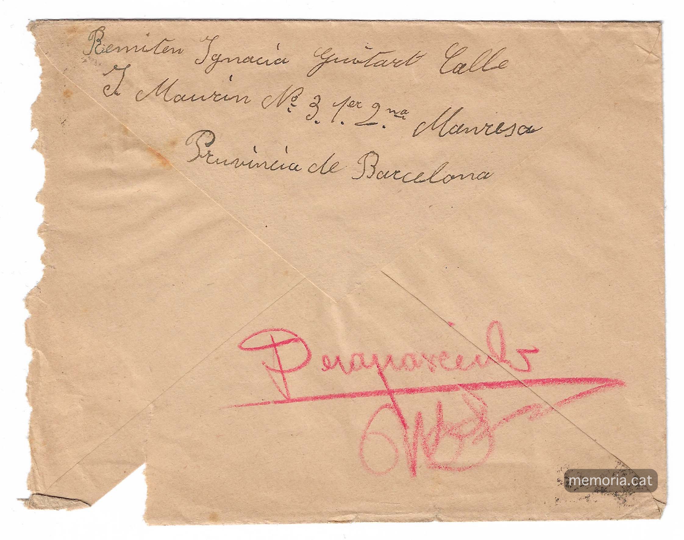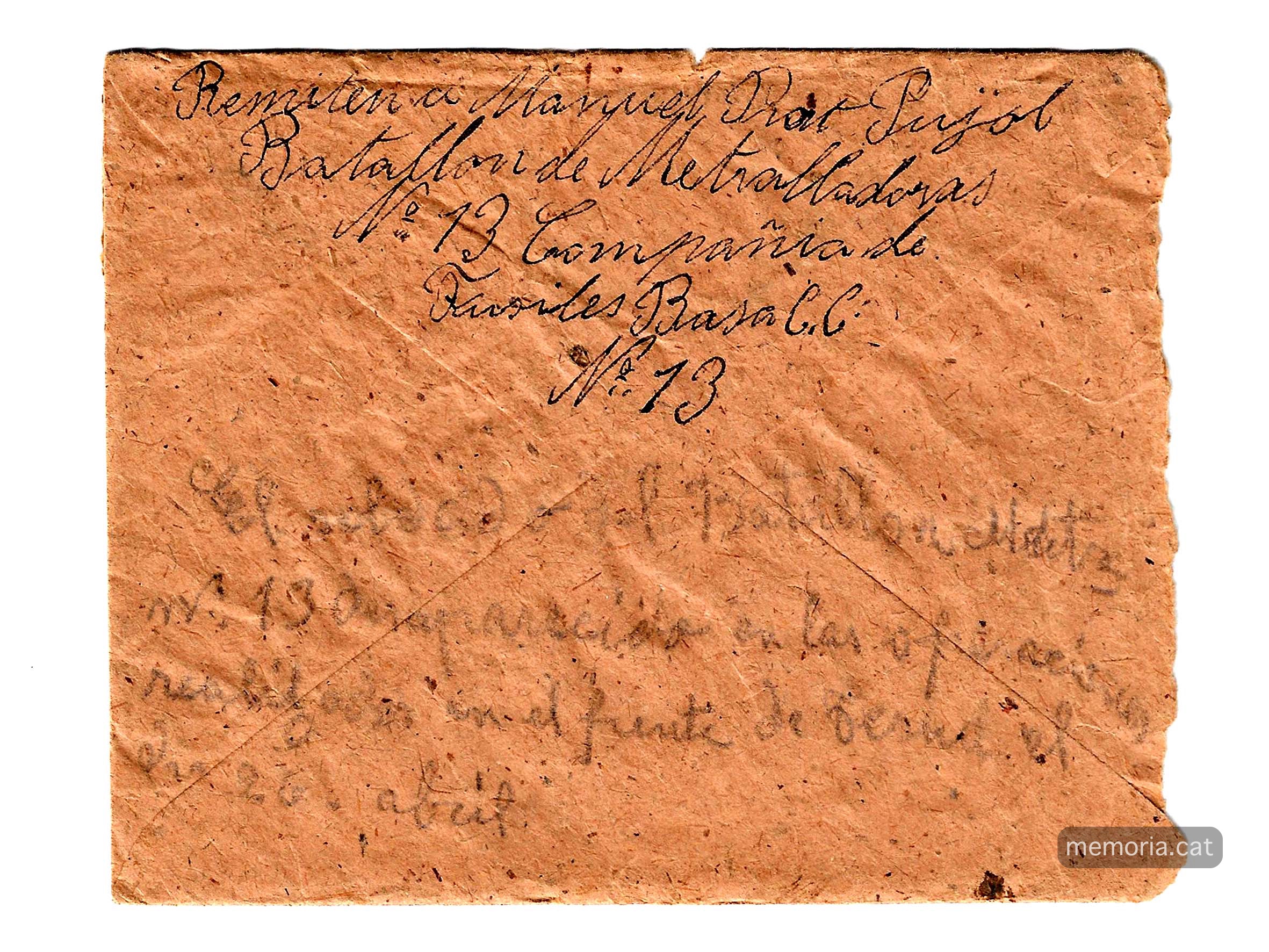 Aquesta carta conserva el seu sobre, és dels tres que ens han arribat que està guixat amb una gran D de “desaparecido”; es van enviar conjuntament amb la carta anterior número 12 escrita per la Ignàsia Guitart. És una carta certificada perquè es volia assegurar que arribés al seu destinatari ja que contenia els dos cigars esmicolats que li trametia el Sebastià Prat. És en el revers d’aquest sobre que figura el mata segells de retorn amb data de 22 de maig.