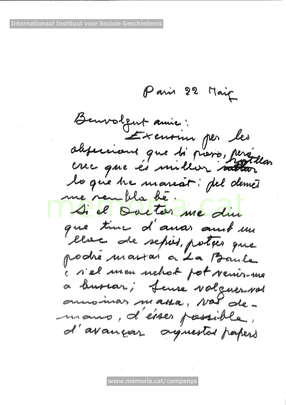 22/05/1970. Carta de Carme Ballester a Josep Ester en què li demana d’agilitar els tràmits de la demanda d’indemnització, “car li dic que això em té un xic nerviosa i m’agradaria poder-ho liquidar lo més ràpid que sigui, i així saber si o no això es podrà resoldre”. (Internationaal Instituut voor Sociale Geschiedenis. Amsterdam).