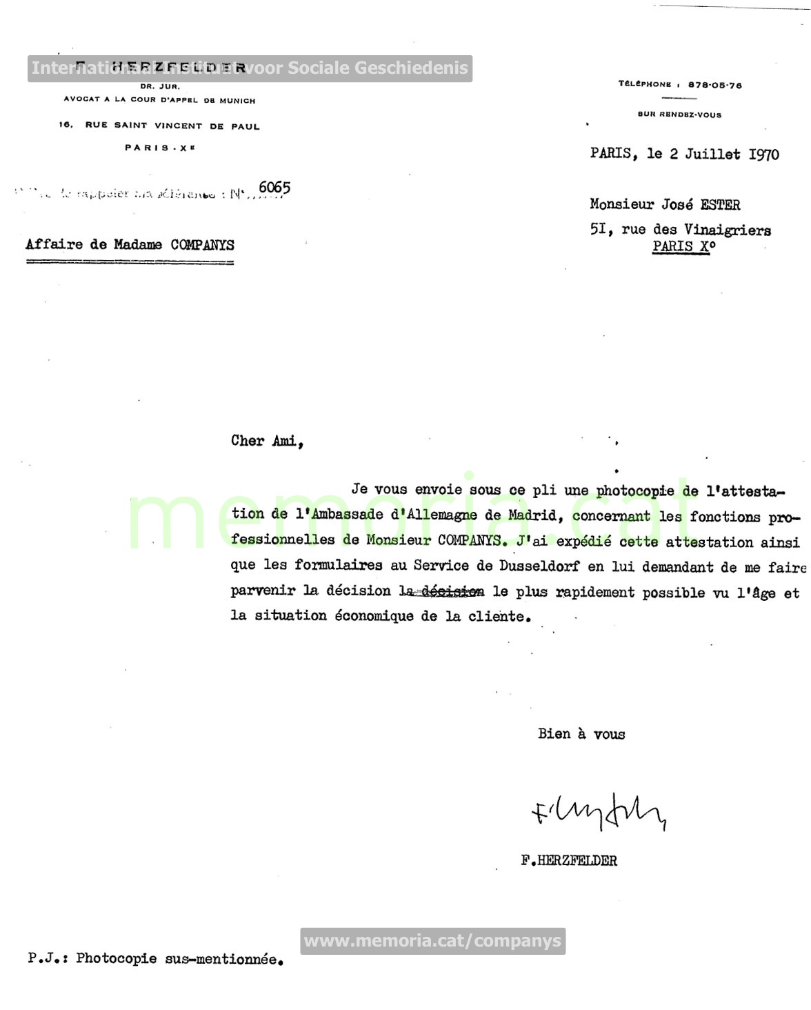 2/07/1970. Carta de François Herzfelder a Josep Ester. S’hi afirma que ha requerit una resposta ràpida de les autoritats alemanyes “atesa l’edat i la situació econòmica de la meva clienta”. (Internationaal Instituut voor Sociale Geschiedenis. Amsterdam).