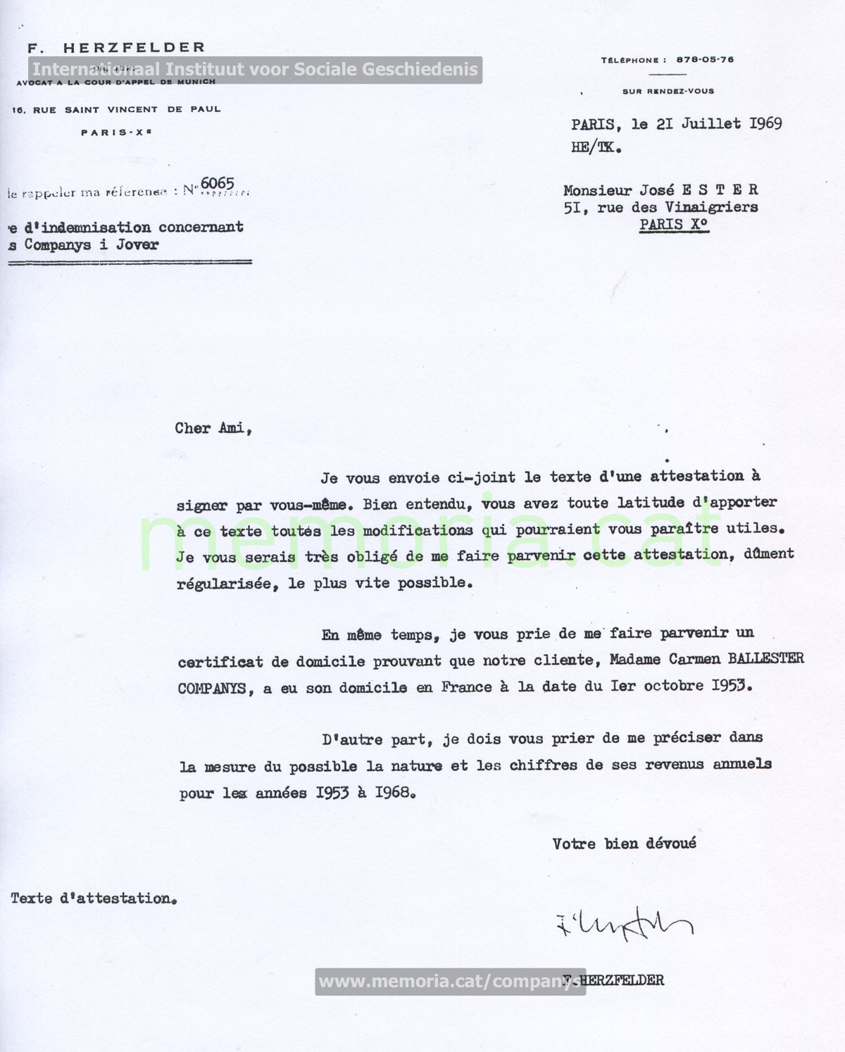 21 i 23/07/1969. A l’esquerra, carta de l’advocat François Herzfelder a Josep Ester en què li reclama diversa documentació per a la defensa de Carme Ballester i en què li suggereix el text d’un certificat a favor de la vídua de Lluís Companys. A la dreta, el certificat signat per Josep Ester, emès al cap de dos dies. S’hi fa constar que Carme Ballester “l’1 d’abril de 1958 es va adreçar a la nostra Federació per demanar-nos si podia obtenir cap indemnització d’Alemanya per la mort del seu marit”. També s’hi fa referència a la recent obtenció d’una indemnització per una causa semblant, per part de la vídua del militant de la CNT Miquel Paronella. (Internationaal Instituut voor Sociale Geschiedenis. Amsterdam). (Aquí en podeu llegir la traducció al català).