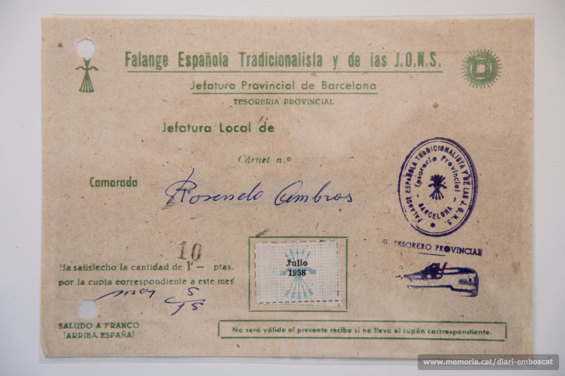 Carnet de la Falange de Castellbell i el Vilar de Rossend Ambròs, pare del Valentí. (Fons Memòria.cat)