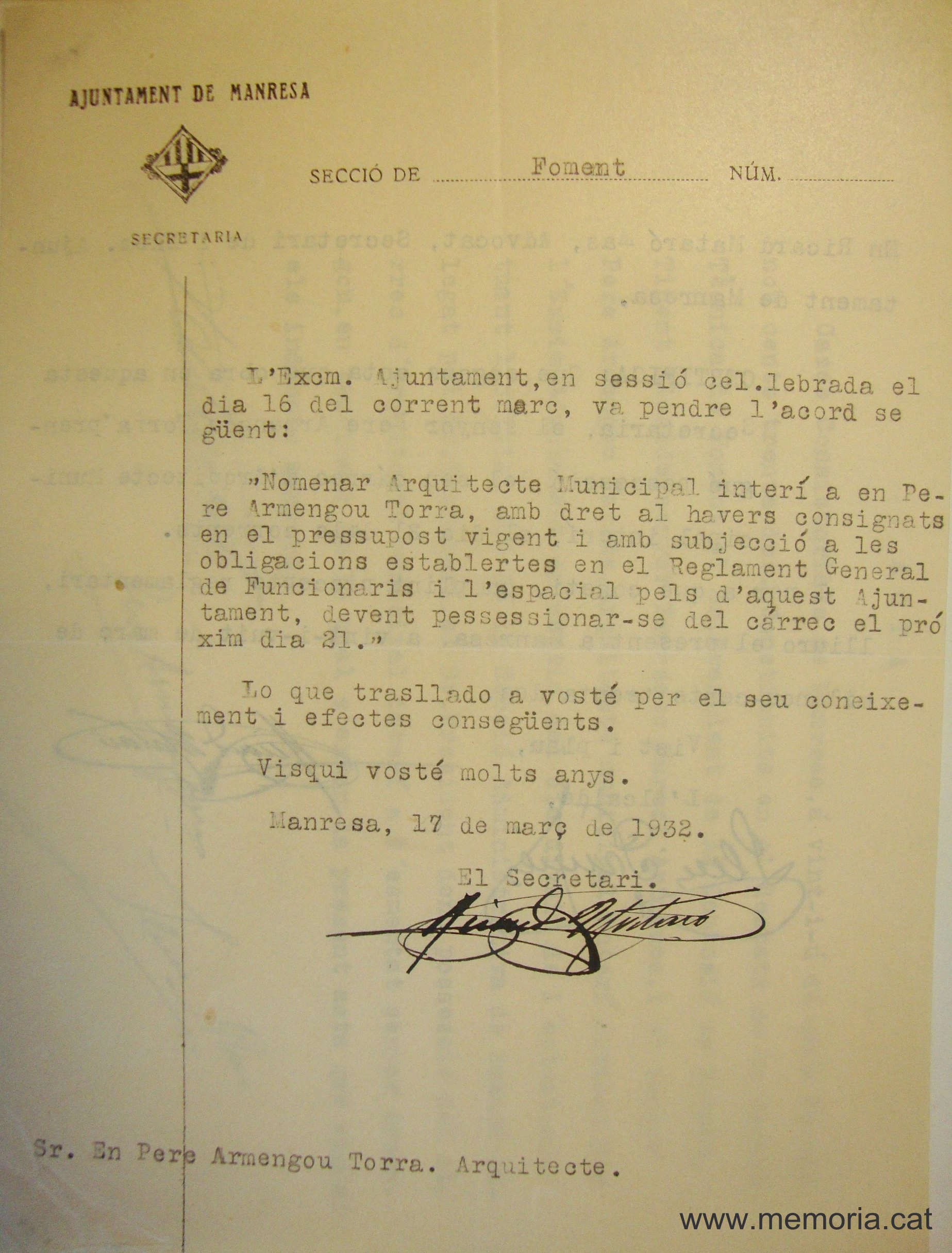 17/03/1932: Nomenament de Pere Armengou Torra com a arquitecte municipal interí (Arxiu Comarcal del Bages).