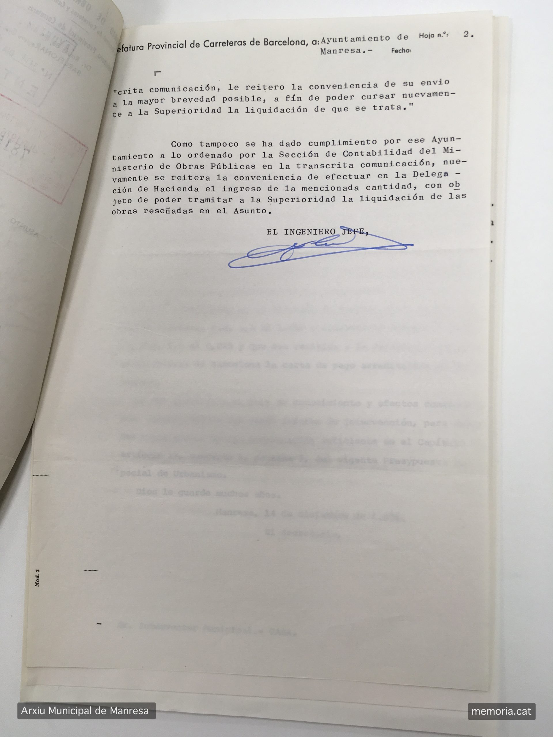 1975-1977: Reclamació del Ministerio de Obras Públicas a l’Ajuntament de Manresa del pagament pendent de les obres i liquidació definitiva per part d’aquest. (Arxiu Municipal de Manresa).