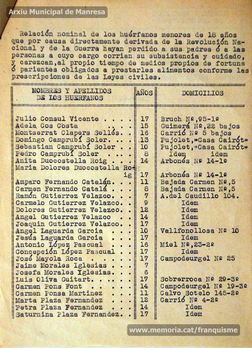 Setembre-novembre de 1943: petició a l’alcalde de Manresa del vicepresident de la “Junta Provincial de Beneficencia de Barcelona“, perquè li enviï la relació nominal d’orfes que té la ciutat, per tal que estiguin atesos. La demanda s’acompanya d’una llista amb els noms, l’edat i el domicili de més de trenta infants orfes de Manresa. L’informe, tramès a l’alcalde, ha estat elaborat per l’inspector en cap de la guàrdia i policia urbana. (Arxiu Municipal de Manresa)