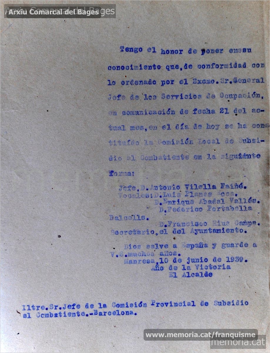 10/06/1939: acta de constitució de la Comisión Local de Subsidio al Combatiente. La junta de l’ens és formada per Antoni Vilella Fainé com a cap; Lluís Planas Roca, Enric Abadal Vallès i Frederic Portabella Balcells en són vocals; Francesc Rius Camps n’és el secretari. (Arxiu Comarcal del Bages)