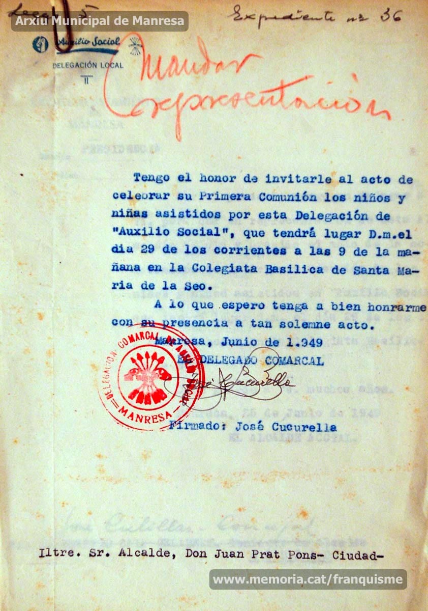 Juny de 1949: invitació del delegat comarcal d’Auxilio Social, Josep Cucurella, a l’alcalde perquè assisteixi a la cerimònia de primera comunió dels infants assistits per la institució, a la Seu. S’acompanya d’una notificació de l’alcalde al regidor Josep Culillas perquè el substitueixi en aquest acte. (Arxiu Municipal de Manresa)