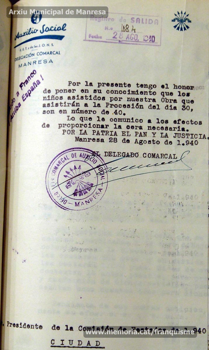 28/08/1940: notificació del delegat comarcal d’Auxilio Social al president de la comissió de festes de 1940 per comunicar-li la presència de quaranta infants a la processó, per tal que ho tingui en compte a l’hora de repartir la cera. (Arxiu Municipal de Manresa)