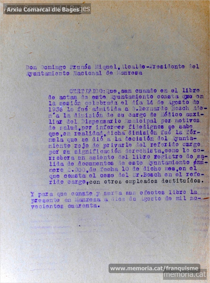 10/8/1940: certificació de l’alcalde de Manresa, Domènec Prunés, que en el llibre d’actes de l’Ajuntament consta que el 14 d’agost de 1936 fou admesa la dimissió del metge municipal Bernat Bosch, per problemes de salut. El batlle, però, fa constar que la dimissió va ser forçada per la seva ideologia: “dicha dimisión fue la fórmula que se dio a la decisión del Ayuntamiento rojo de privarle del referido cargo por su significación derechista”. (Arxiu Comarcal del Bages)