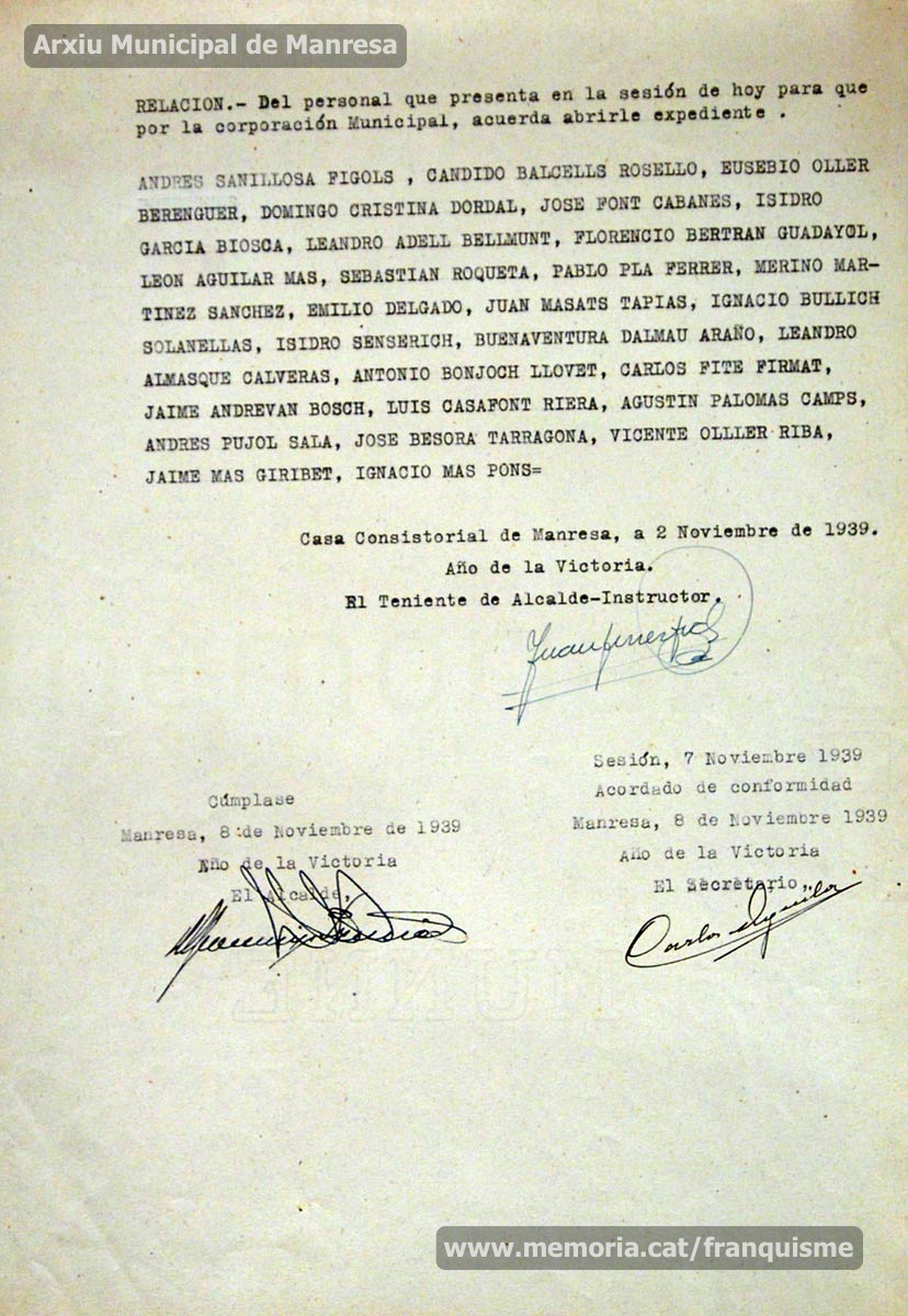 30/12/1939: relació de personal municipal depurat –27 persones- que és acomiadat de l’Ajuntament (Arxiu Municipal de Manresa)