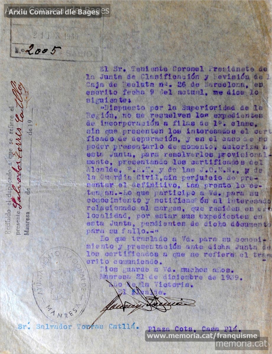 21/12/1939: notificació de l’alcalde de Manresa a Salvador Torras Catllà de les instruccions dictades per la Caixa de Recluta núm. 26” de Barcelona, sobre la resolució dels expedients d’incorporació a files i la necessitat de presentar els certificats de depuració. (Arxiu Comarcal del Bages)