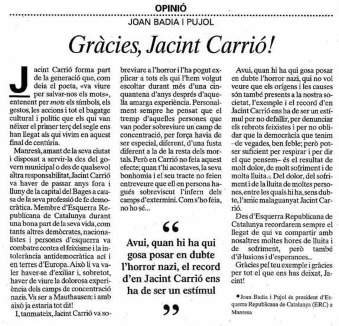 - Badia i Pujol, Joan: “Gràcies, Jacint Carrió!”. Regió 7. 1 de novembre del 2000.