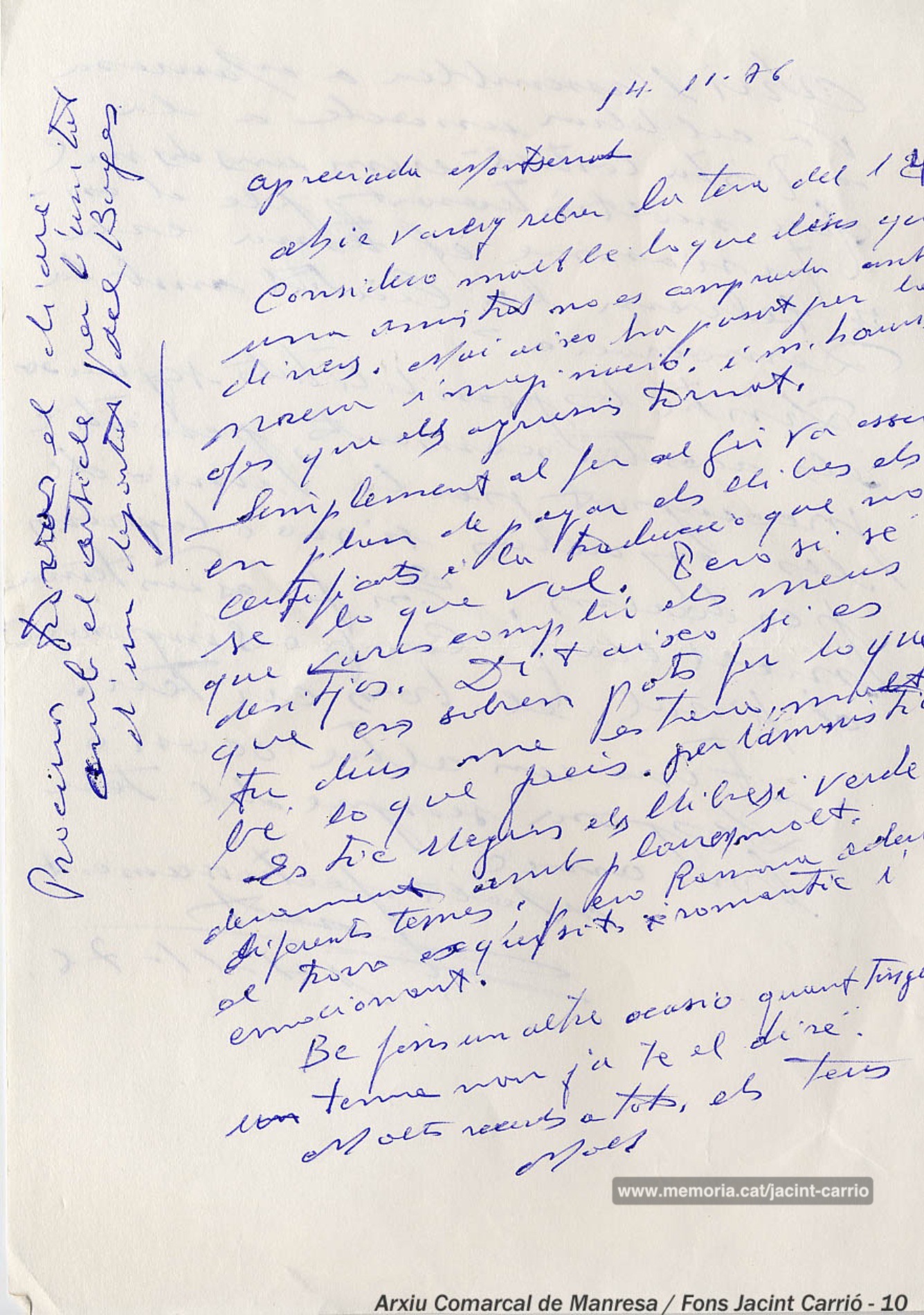 9/07/1975. Esborrany de carta de Jacint Carrió a Montserrat Roig, de la qual seleccionem aquests fragments: “Quatre ratlles per dir-te que l’endemà de la nostra petita xerrada, com acostumes a dir-li tu, vàreig veure a la Lliberia Símbol del nostre Passeig dos llibres teus, “Paral·lels” (*) i Ramona, adéu, però com vàrem quedar que els enviaries (que també els puc comprar aquí) no els vàreig comprar. Avui no he pogut resistir més i he comprat Paral·lels. I si bé no l’he llegit tot, m’entusiasma molt. Veritablement, he de confessar que el dia que vares parlar a la Caixa d’Estalvis em vas convèncer, però jo no sabia res del teu treball que portes a cap com a escriptora. I avui em dol molt que quan vares venir a casa no hagués sabut el que ara sé… Doncs sóc de una classe modesta a causa del meu treball potser o de la por que encara tinc al cos des de l’estada als camps, si bé el teu llibre m’ha ensenyat molt i procuraré reviure el meu esperit…”. (Arxiu Comarcal del Bages. Fons Jacint Carrió i Vilaseca)