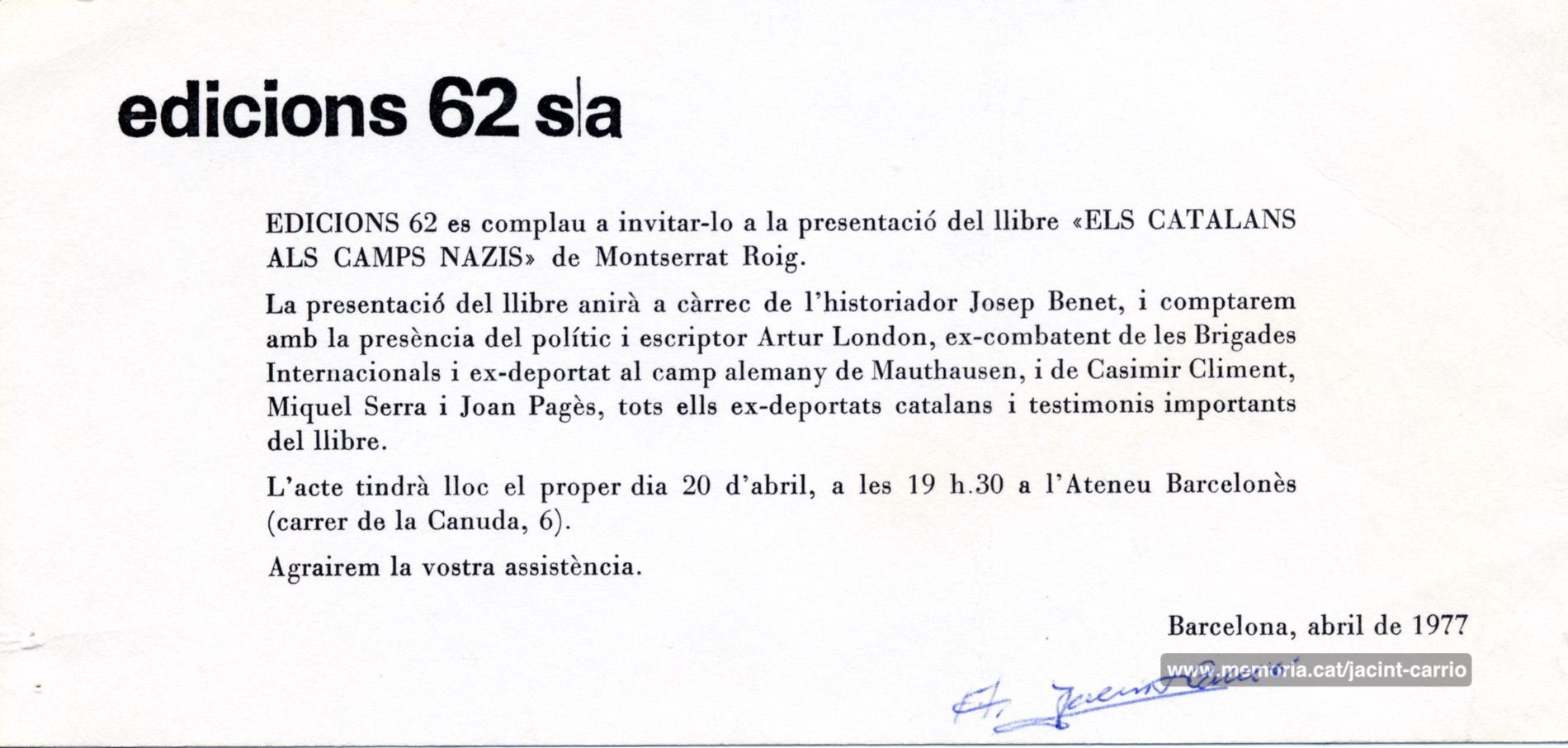 Abril 1977. Invitació d’Edicions 62 a l’acte de presentació del llibre de Montserrat Roig Els catalans als camps nazis a l’Ateneu Barcelonès. (Arxiu Comarcal del Bages. Fons Jacint Carrió i Vilaseca)