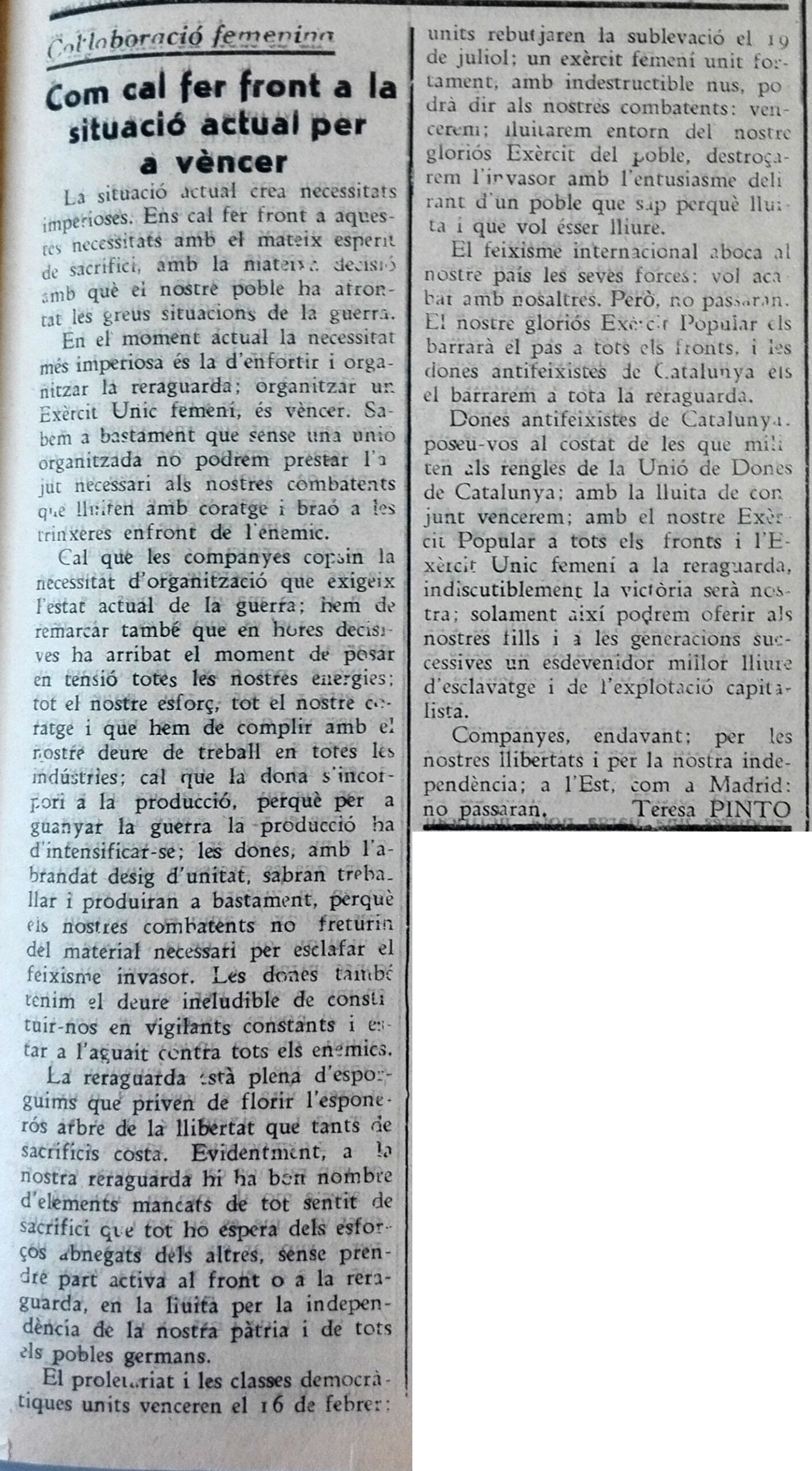 Convida a totes les dones antifeixistes a unir-se a la Unió de Dones de Catalunya, i proposa l’Exèrcit Únic Femení a la rereguarda per, juntament amb l’Exèrcit Popular, aconseguir la victòria.