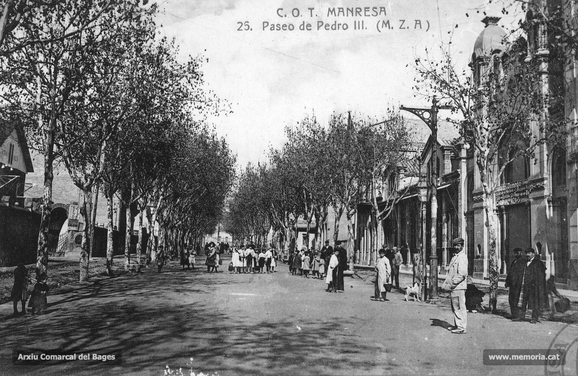 El passeig de Pere III, anomenat també la via Apia manresana, en una estampa del tombant del segle XX, obtinguda des del davant del Teatre Conservatori. El 1891, aquesta ampla artèria urbana va ser inaugurada amb tots els honors: era el senyal inequívoc de la puixança de la burgesia manresana que, sentint-se incòmoda dins l'estretor dels carrers de la ciutat antiga, cercava desassossec i distinció en l'eixample.