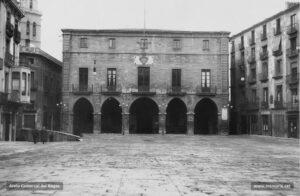 Perspectiva de la Plaça Major i la Casa de la Ciutat. Aquest majestuós edifici fou bastit entre els anys 1739 i 1777 sota les ordres del mestre d'obres Jeroni Torrents, per reemplaçar la casa del Consell de la Ciutat, que des del 1658 ocupava el mateix solar i que l'any 1713 havia estat incendiat. Durant molt de temps, a la planta principal es trobava el despatx de l'Alcaldia, les oficines i el Saló de Plens (inaugurat el 1885); i, a la segona planta, l'Arxiu, la Biblioteca i el Museu Municipal, serveis creats l'any 1896 sota l'alcaldia de Francesc Gallifa i Gomis. Avui dia, tot l'edifici és destinat a dependències municipals.