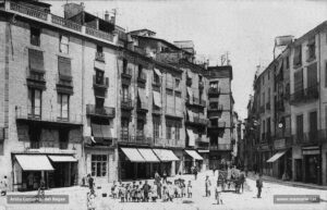 Fotografia dels anys deu del segle XX. Extrem nord-est, amb el final del carrer de Sobrerroca en la confluència amb el carrer del Cap del Rec i la històrica adrogueria del "Ferrer de la Plaça" i l'antiga farmàcia Oliveras, en les cases de la famíla Oms i March.