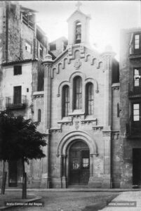 Instantània de l'església de la Mare de Déu de la Consolació, inaugurada el 1900 i avui desapareguda, la qual es va edificar just al davant del lloc on hi havia l'antiga capella de Valldaura. La fotografia correspon al moment de la seva construcció. A nivell arquitectònic, pertany a l'estil neogòtic, molt usual a l'època. Després de la guerra, aquesta església seria ocupada pels pares Caputxins, els quals l'any 1959 feren bastir una església de majors dimensions, és a dir, l'actual parròquia de la Mercè.