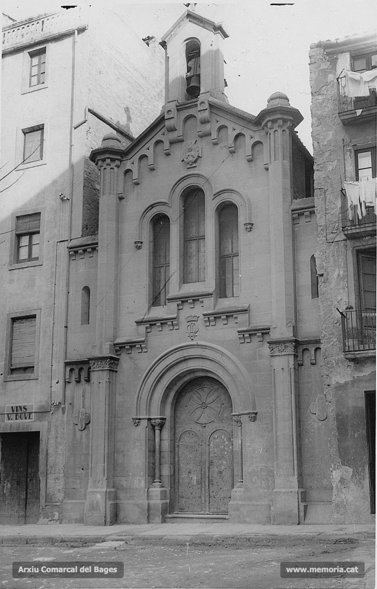 Instantània de l'església de la Mare de Déu de la Consolació, inaugurada el 1900 i avui desapareguda, la qual es va edificar just al davant del lloc on hi havia l'antiga capella de Valldaura. La fotografia correspon al moment de la seva construcció. A nivell arquitectònic, pertany a l'estil neogòtic, molt usual a l'època. Després de la guerra, aquesta església seria ocupada pels pares Caputxins, els quals l'any 1959 feren bastir una església de majors dimensions, és a dir, l'actual parròquia de la Mercè.
