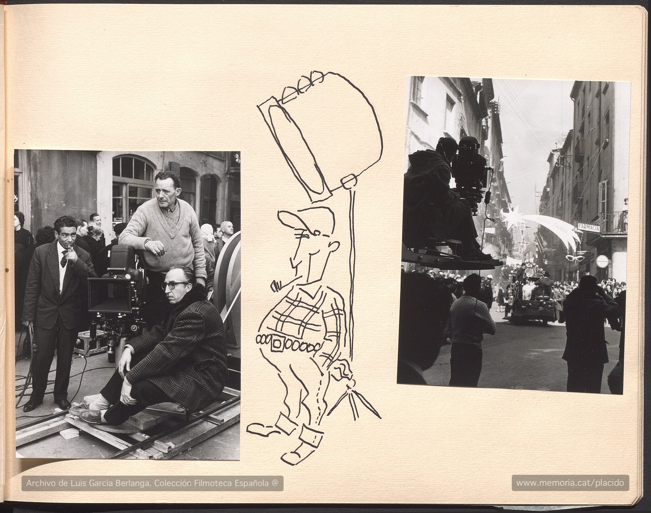 Berlanga és el protagonista de les dues fotografies preses en el rodatge de les escenes de l’estació de la Renfe. Esparbé hi fa sortir dos dibuixos de dos elements importants de la història: el motocarro amb l’estrella i les olles de pressió “Cocinex” que es publiciten en la cavalcada i que la paguen. (Archivo de Luis García Berlanga. Colección Filmoteca Española @).
