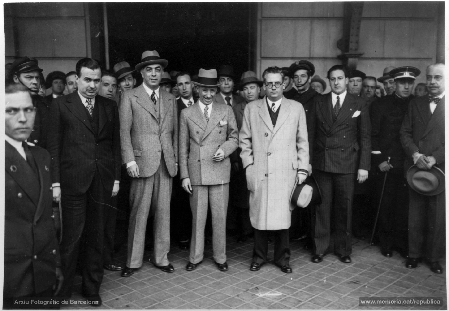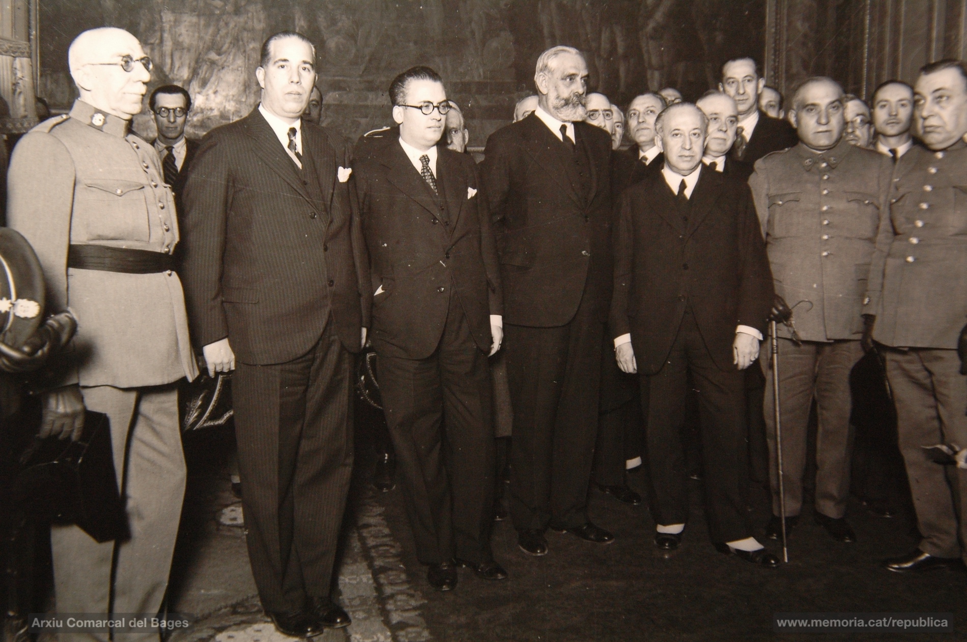4-9-1933. Joan Selves i Carner pren possessió del càrrec de Governador General de Catalunya. D’esquerra a dreta, Claudi Ametlla, Carles Pi i Sunyer, Francesc Macià, Lluís Companys, Joan Selves i Carner i Jaume Aiguader.