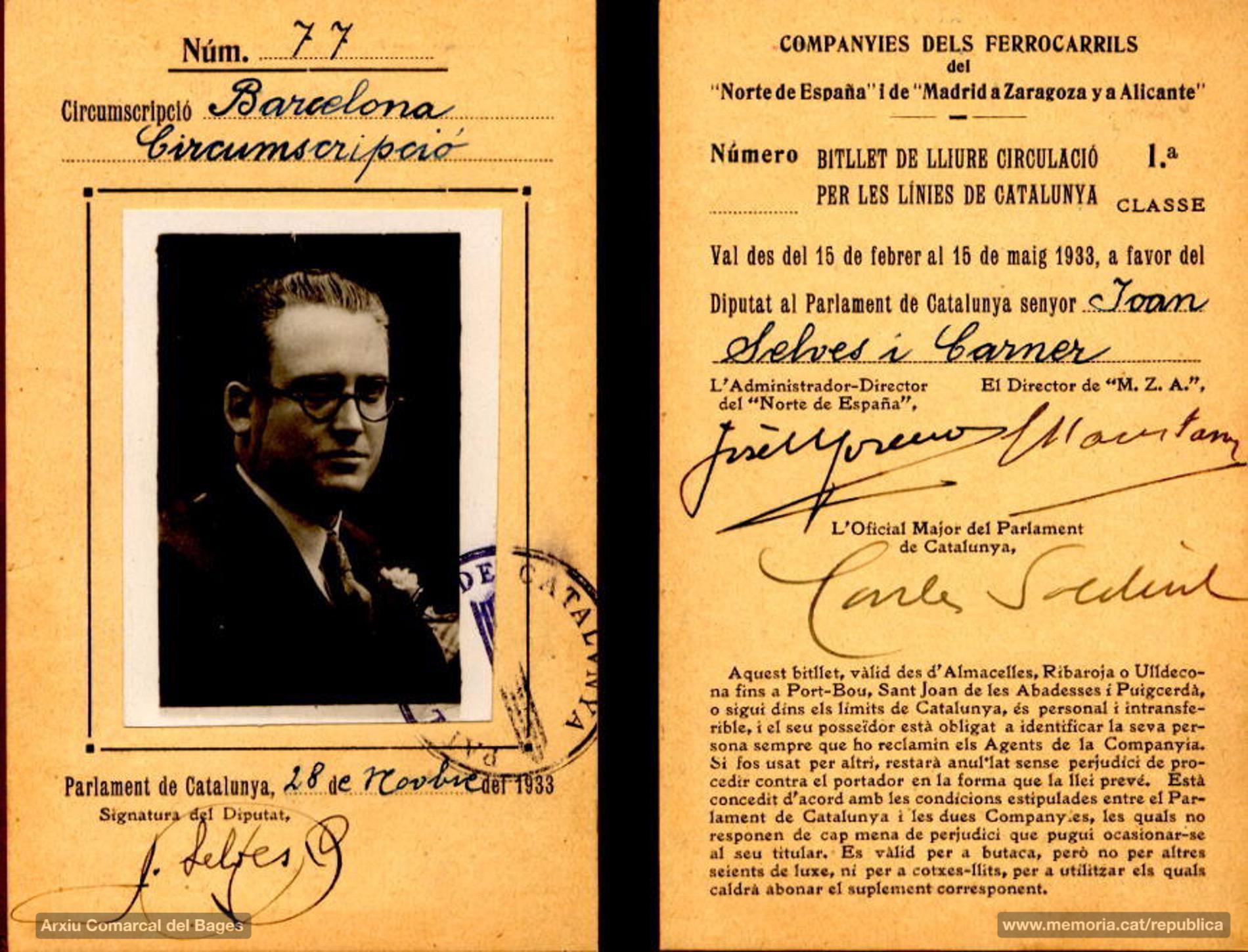 ANYS 1931-34. Carnet d’alcalde-president de Manresa; carnet d’Esquerra Republicana de Catalunya; carnet de la Federació de la Premsa i de la “Asociación de Periodistas Extranjeros”; bitllets de lliure circulació per Catalunya i pel trajecte a Madrid; carta de renúncia de Joan Selves a l’alcaldia de Manresa en haver estat elegit diputat a Corts; nomenament de Conseller de Governació per part de Lluís Companys; foto de Lluís Companys dedicada a Joan Selves; notes de Lluís Companys amb motiu de la mort d’en Selves; nota de Ventura Gassol a la mort d’en Selves; telegrames diversos, entre ells el d’Aniceto León, amb motiu de la mort d’en Joan Selves; caixeta de la Constitució de la II República aprovada quan Selves era diputat a Corts Constituents; escut d’alcalde de Manresa.