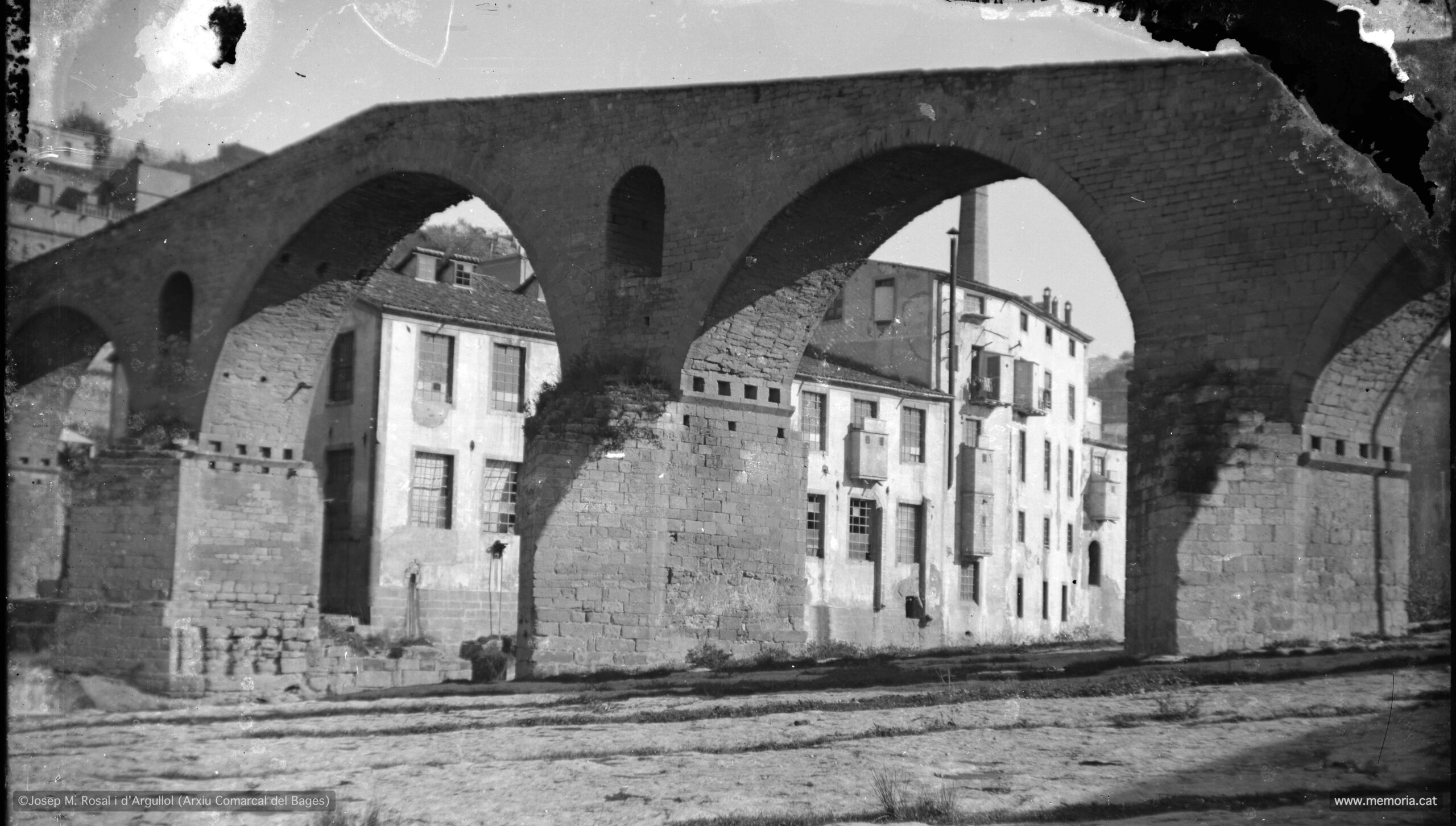 El Pont Vell, amb la resclosa de la fàbrica al seu darrera i, per damunt, el Puigcardener amb l’edifici de la Seu